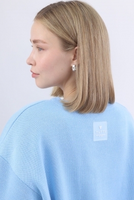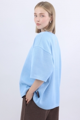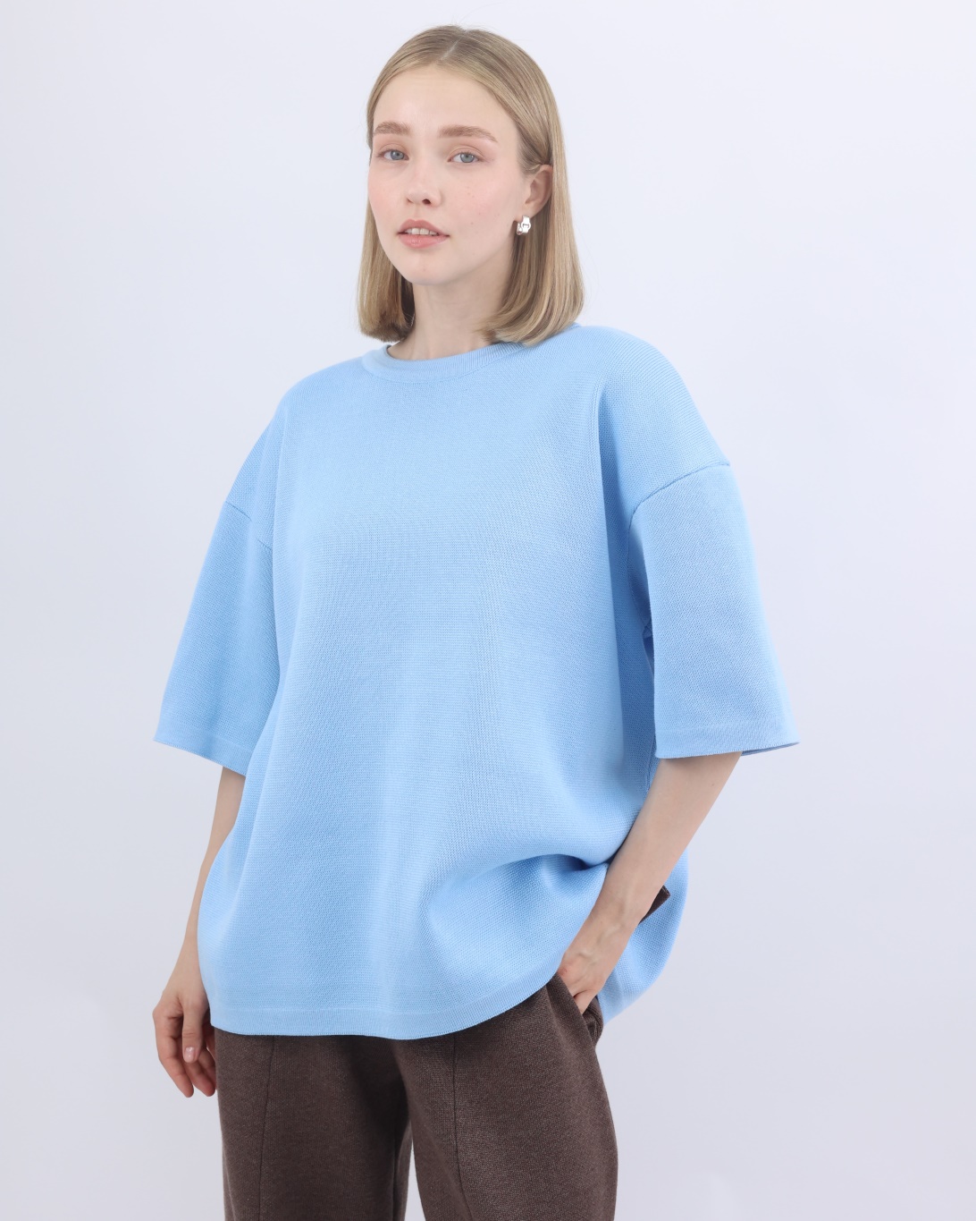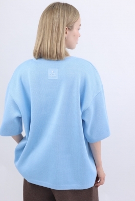 Футболка свободного кроя, плотная, голубого цвета. Связанная из мягкого смесового хлопка. Отлично сочетается с любым видом брюк, юбок или шорт.