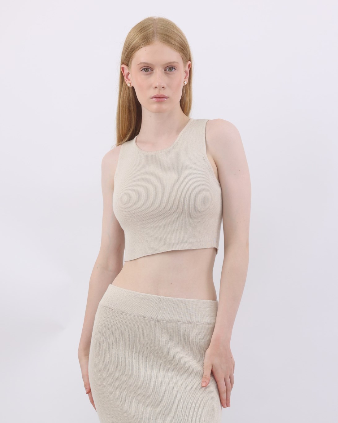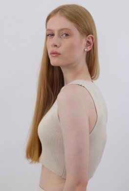 Базовый укороченный топ с круглым вырезом в кремовом цвете. Связанный из мягкого смесового хлопка.