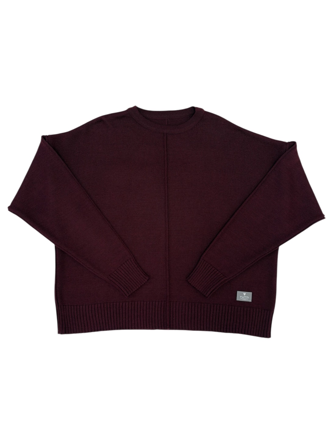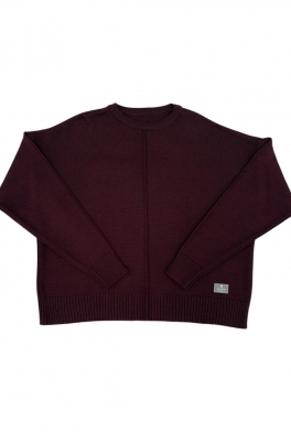 Укороченный джемпер с удлиненным рукавом и декоративными строчками в бордовом цвете. Связан гладью из мягкого смесовой шерсти мериноса.
