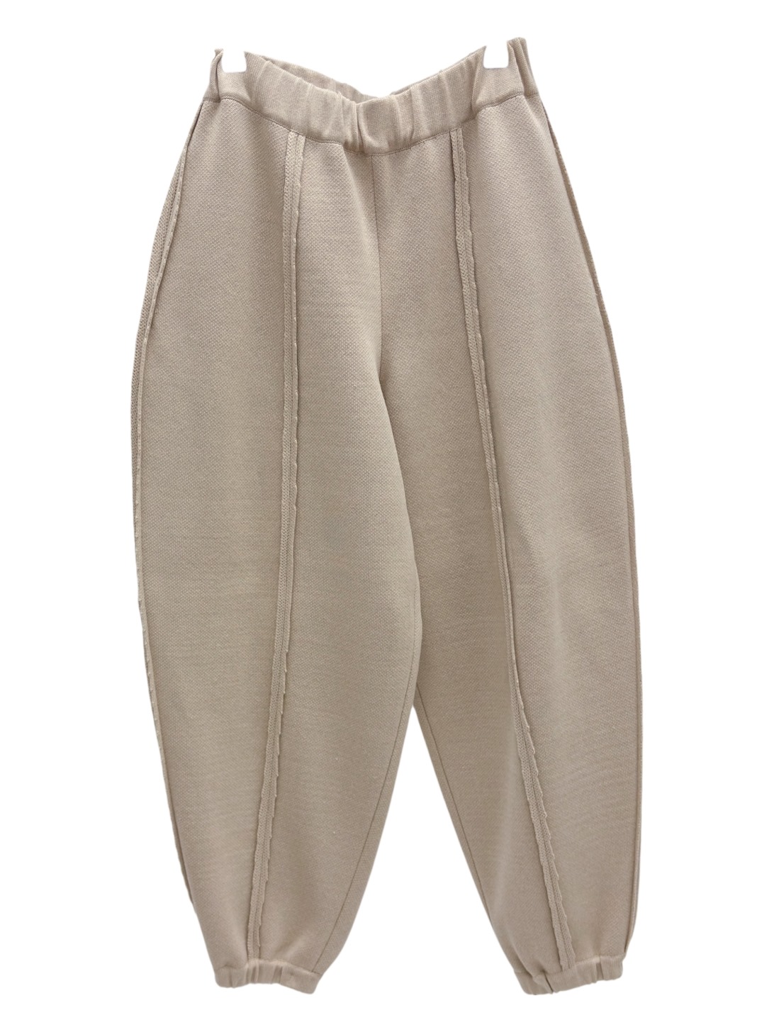 Универсальные брюки-бананы из мягкого смесового хлопка в бежевом цвете. Пояс и манжеты на резинках. Прекрасно сочетаются со всеми нашими верхами. Швы как детали на передней части брюк и удобные карманы.
