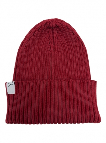 Базовая шапка бини из хлопка в вишневом цвете. Вязка резинкой 2:2, макушка стянута.