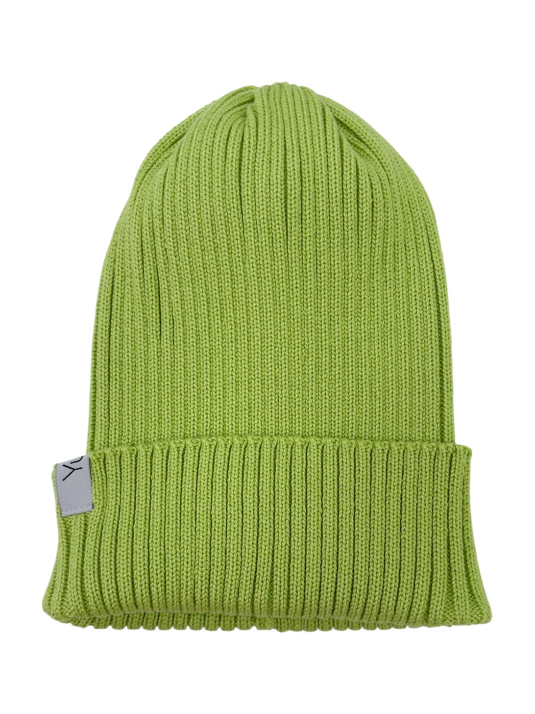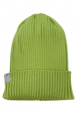 Базовая шапка бини из хлопка в липовом цвете. Вязка резинкой 2:2, макушка стянута.