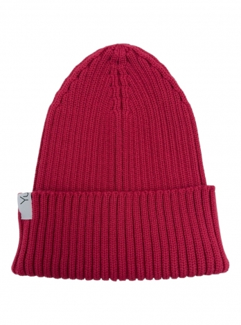 Базовая шапка бини из хлопка в холодном красном цвете. Вязка резинкой 2:2, макушка стянута.